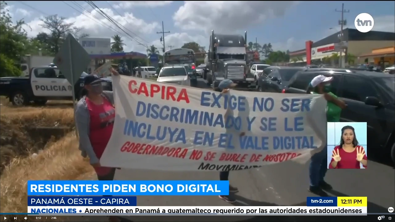 Residentes de Capira cierran vía Interamericana, exigen ser incluidos en el Vale Digital Moradores de Capira cerraron la vía Interamericana este martes 26 de enero, para ser incluidos en el beneficio del bono digital.