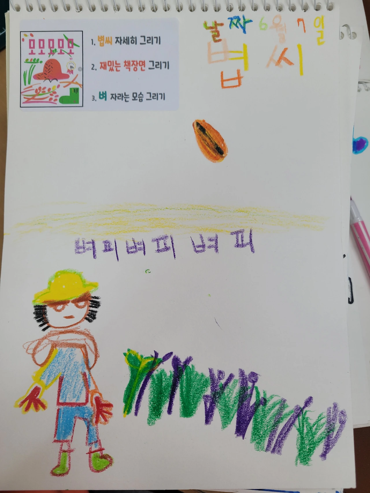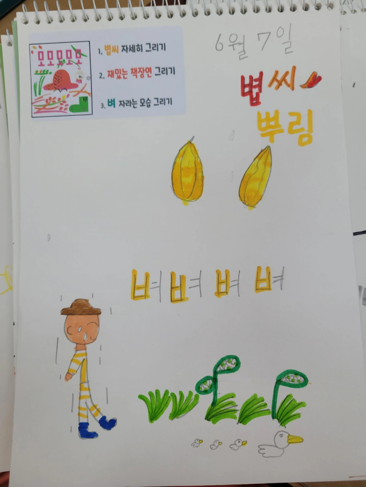 “벼를 심을 거야. 벼를! 그림책 먼저 읽어줄게. <모모모모모>.”