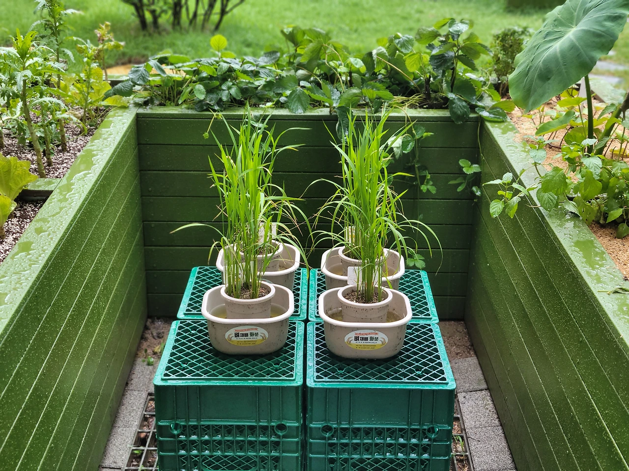 벼 화분을 교실 창가에 두었다. 벼싹이 나고 손 한 뼘 정도 자랐을 때, 교실 건물 바로 바깥에 두었다. 처음부터 바깥에 두면, 새 모이가 되어 버리기 십상이다. 두 뼘 정도 자랐을 땐, 전교생 모두가 볼 수 있게 학교 텃밭 입구에 두었다.