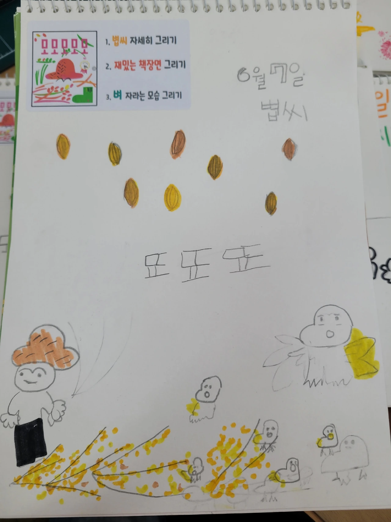 작가가 위트 있게 그려놓은 재미있는 그림 조각들이 장면 곳곳에 속속 숨어있다. 6학년 아이들과 읽을 때는 보이지 않던 그림 조각들. 두 번째 읽노라니, 훤하게 보인다. 읽고 나서, 제일 재미있었던 장면을 서로 나누었다. 그리고 모둠별로 나누어 준 볍씨를 나누어주었다. 자세히 관찰하고, 볍씨도 한번 그려보라 했다.