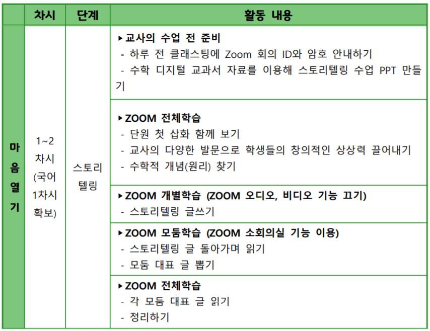 오늘은 선생님과 ZOOM에서 국어, 수학을 통합한 스토리텔링 수업을 할 거예요. 우리 줌두레 때 모둠 문장과 이야기 만들었었죠? 그때처럼 하면 돼요. 그림을 보고 마음껏 상상한 이야기를 글로 쓰면 돼요.