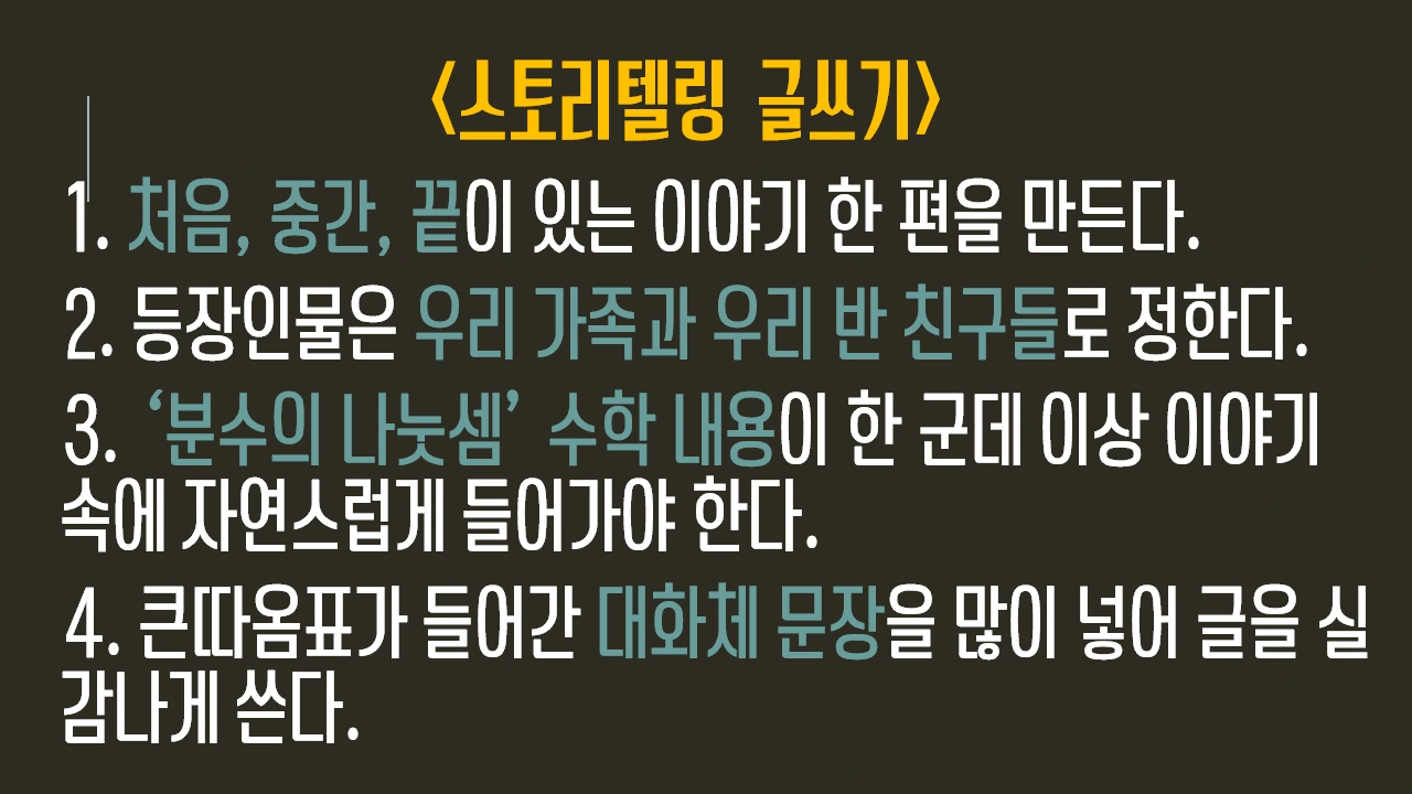 3. 수학 내용이 이야기 속 한 군데 이상 자연스럽게 들어가야 한다.