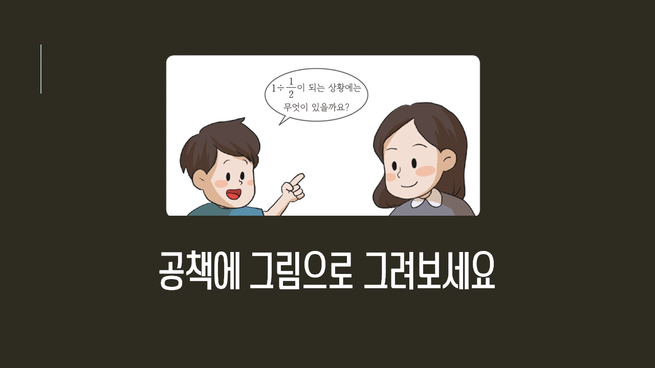 (한 아이가 1÷2가 되는 상황을 말했다. 표정을 보니 몇몇 아이들이 1÷2와 1 ÷ 1/2 상황을 구분하지 못하는 것 같았다. 공유 화면에 그림을 그려가며 그 차이를 설명하는데 5분 정도 시간을 썼다.)