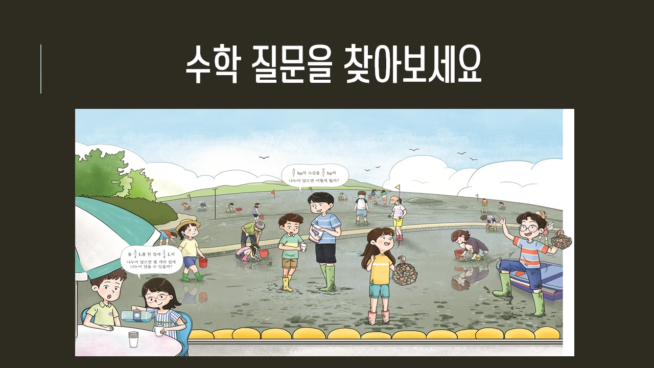 다시 교과서 그림으로 넘어갈게요. 그림 속에 수학 질문들이 몇 군데 보이죠? 이 모둠이 얘기해주세요.