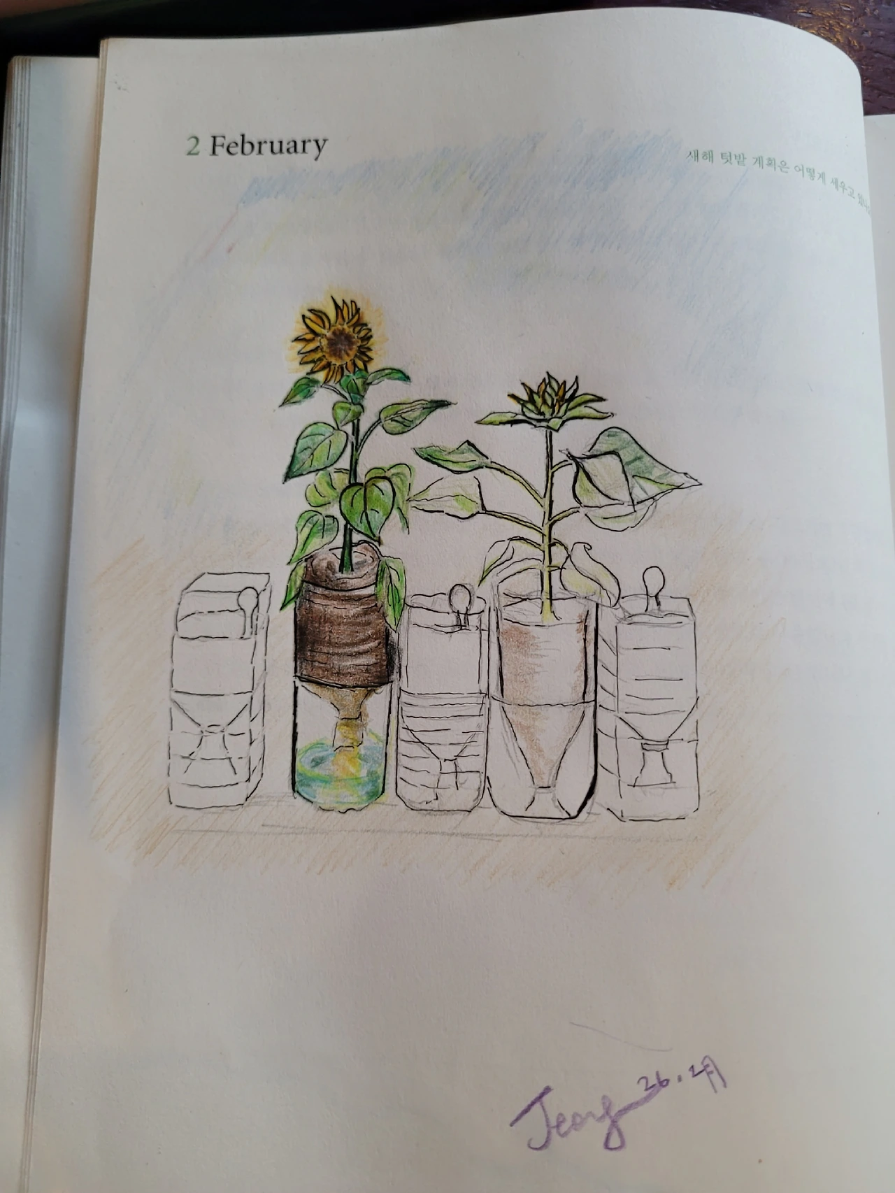화양연화는 늘 짧게 느껴진다. 가까이 곁에 두고 보면, 그 순간이 조금 더 길어지지 않을까 싶어 올해는 아이들과 함께 교실에서 해바라기를 키워보았다. 페트병 화분을 잘라 흙을 담고 발효계분을 조금 넣어 저면관수용 화분을 만들었다. 흙이 거름과 촉촉히 섞일 수 있도록 일주일을 기다렸다가 아이들에게 미니 해바라기 씨앗 한개씩 나누어주었다. 이 중 몇 개나 꽃을 피울까?