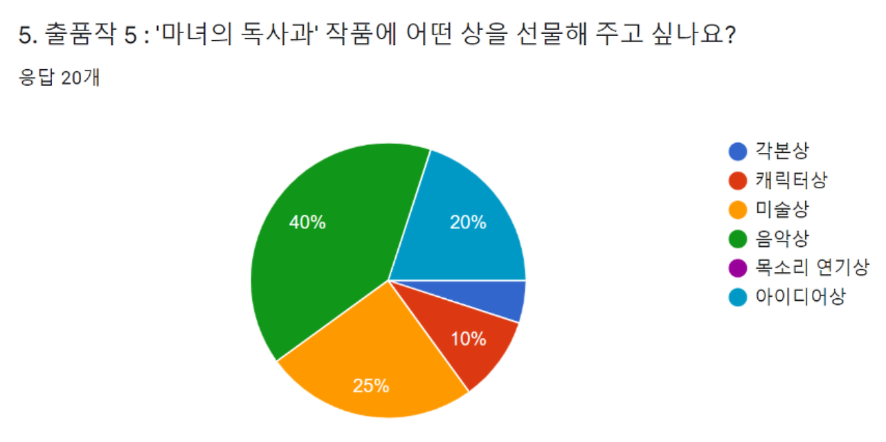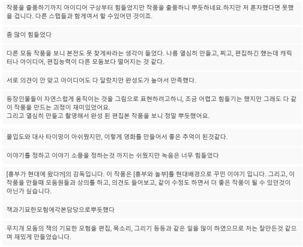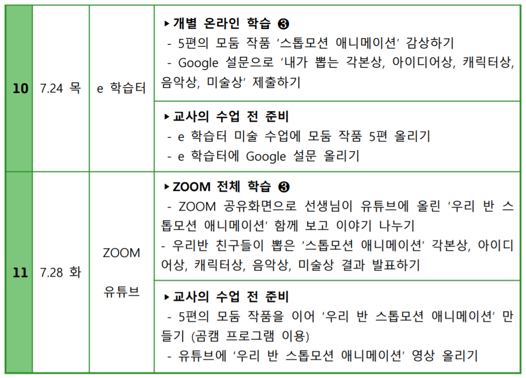 모둠 출품작 5편의 영상을 e학습터 미술 수업에 올리고, 구글 설문으로 각 모둠에게 줄 상을 뽑고 질의, 소감 발표를 하기로 했다. 그리고 다음 주 ZOOM 줌두레에서 결과를 발표하기로 했다.