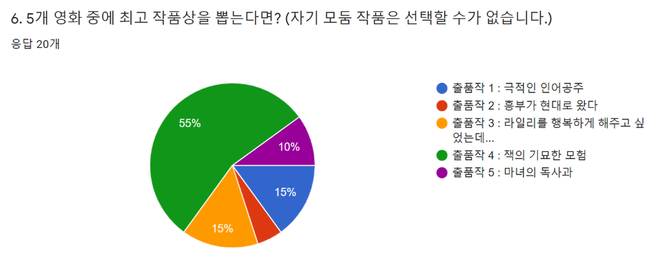 '극적인 인어공주'와 '라일리를 행복하게 해주길 바랬는데'는 캐릭터상, '흥부가 현대로 왔다'와 '잭의 기묘한 모험'은 아이디어상, '마녀의 독사과'는 음악상을 받았다. 최고작품상은 예상대로 무지개 모둠의 '잭의 기묘한 모험'에게 돌아갔다. 절반이 넘는 아이들의 지지를 받았다.