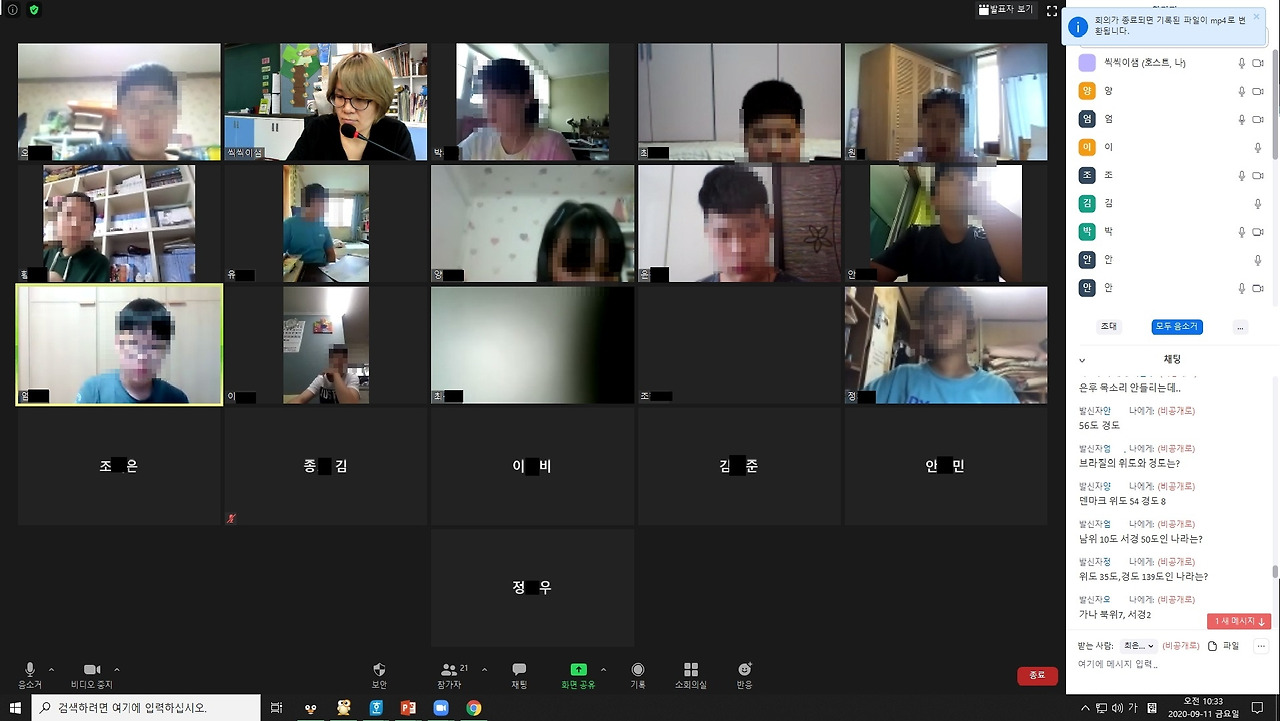 아이들이 만들어 비공개 채팅으로 보내 준 문제를 내가 읽어주면, 아이들이 비공개 채팅으로 정답을 보내주었다. 그러면 문제를 낸 아이가 공유화면으로 자기 구글어스 창을 보여주며 정답을 말하고 위도, 경도를 다시 설명했다.