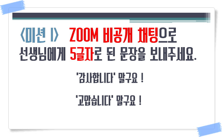 "첫 번째 미션, 선생님에게 '비공개 채팅' 보내기. 지금 선생님에게 하고 싶은 말을 '5글자'로 보내주세요. '안녕하세요', '고맙습니다' 이런거 안 받겠습니다. 여러분의 상상력을 기대할게요."