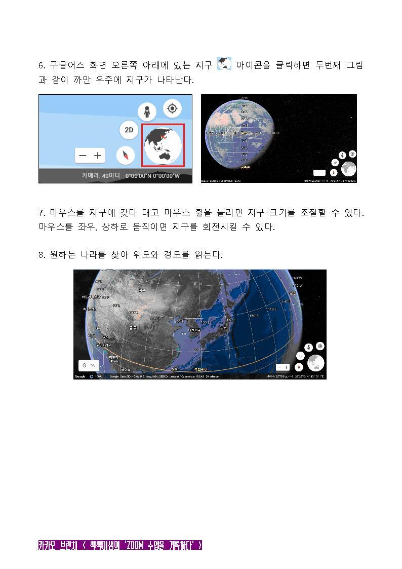 사회 교과서를 보며 위도와 경도에 대해 아이들에게 간단히 설명한 다음, ZOOM 공유 화면으로 구글어스를 보여주었다.