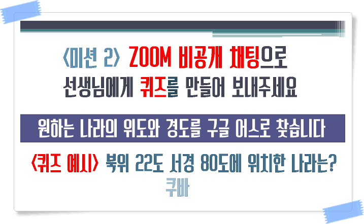 "자, 이제 두 번째 미션. 선생님에게 비공개 채팅으로 퀴즈 문제를 만들어 보내주세요. 선생님이 대신 읽어주겠습니다. 친구들이 낸 문제를 잘 듣고, 어떤 나라인지 구글어스에서 직접 찾아보세요. 정답을 알겠으면 선생님에게 비공개 채팅으로 보내주기."