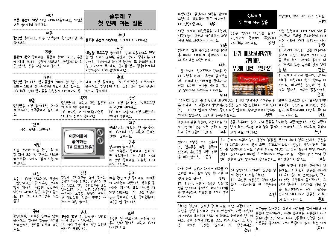 여름학급문집 '우연시'에 실은 서클 질문 답변들