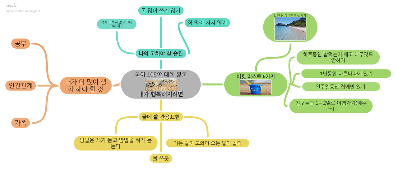 교과서에는 '행복한 우리 반을 위한 약속 정하기'가 소재로 나와있는데, '내가 행복해지려면'으로 바꾸었다. '내가 행복해지려면'을 가운데 큰 주제에 놓고 가지를 4개 만들어 '나의 고쳐야 할 습관', '버킷 리스트 5가지', '글에 쓸 관용표현' , '아이들이 직접 만들어보는 소주제'라 적었다. 두 번째 수업이어서 그런지 아이들은 척척 해냈다.
