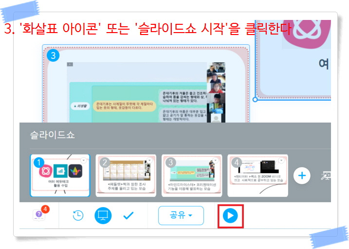 디지털 리터러시의 최강자 혁준이가 방법을 찾아냈고,혁준이는 다른 모둠 아이들에게 프리젠테이션 설정 방법을 ZOOM 공유 화면으로 설명해주었다. 덕분에 나도 배웠다.
