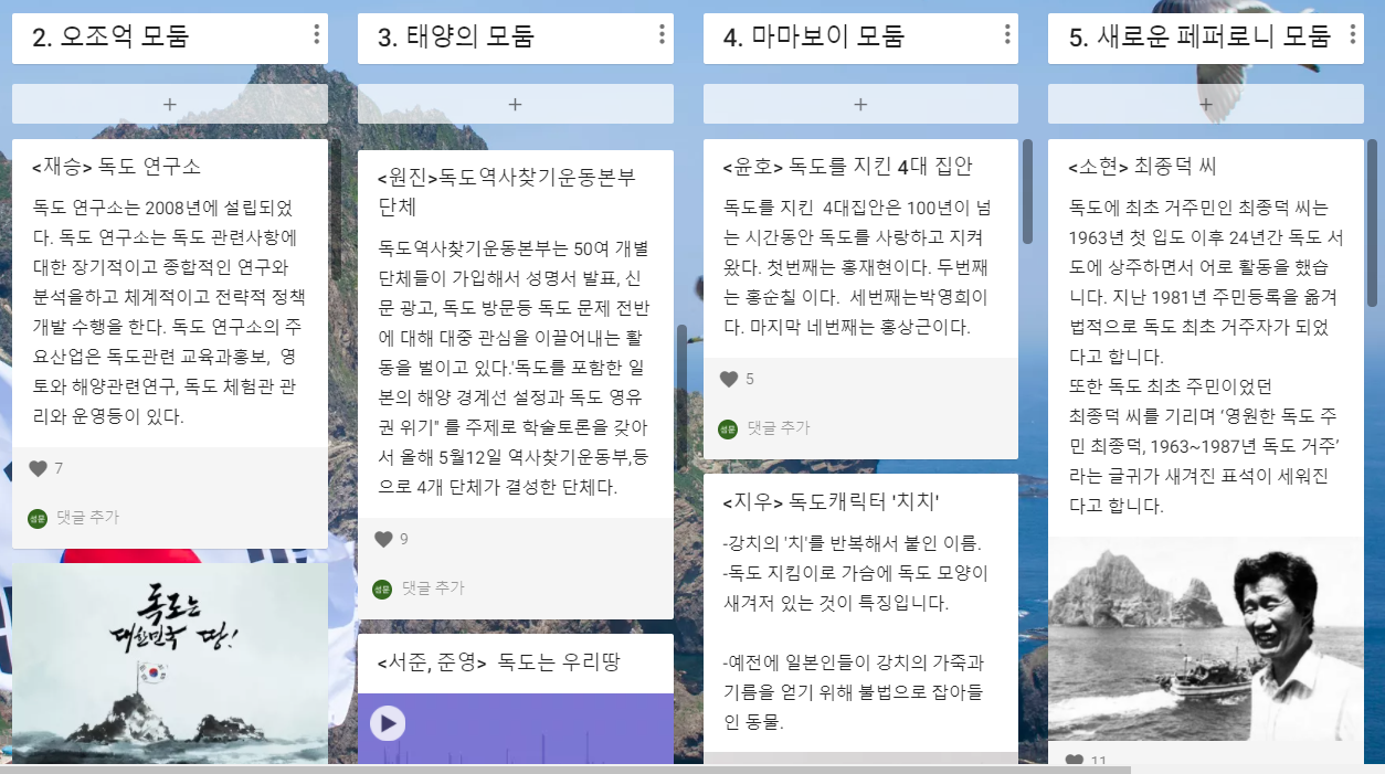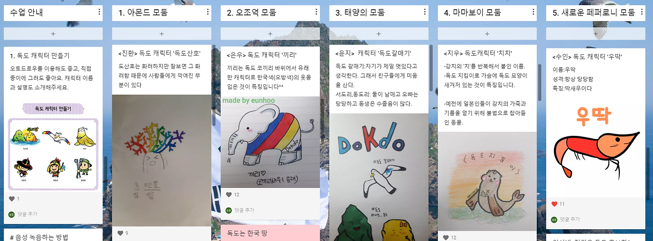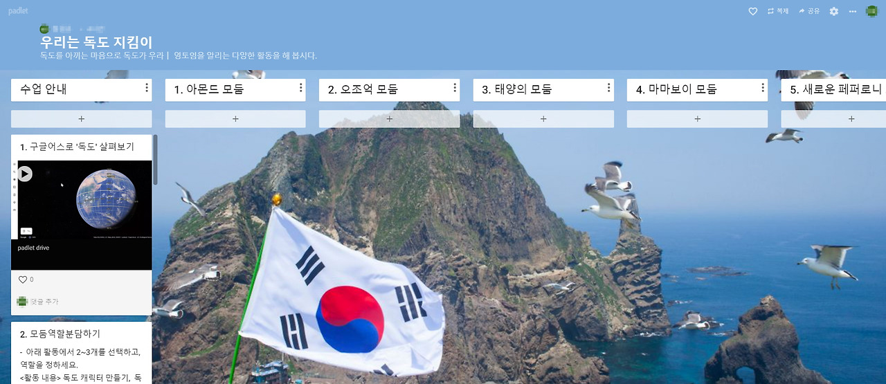 네이버에서 '독도 자연환경'으로 검색하여 얻은 이미지로 배경화면을 바꾸었다. 그리고 패들렛 스타일을 '셀프'로 선택하고, 수업 안내와 모둠 이름을 담은 6개 컬럼을 만들었다.