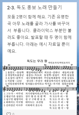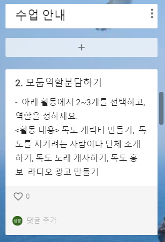 아이들이 패들렛에 접속하면 스스로 수업을 할 수 있게 '수업 안내' 컬럼에 활동 안내 게시물을 올렸다. 아이들은 내가 미리 녹화해서 올려놓은 구글어스 독도 영상을 시청하고, 모둠 회의를 통해 독도를 지키는 다양한 활동거리(독도 캐릭터 만들기, 독도를 지키려고 노력하는 사람이나 단체 소개하기, 독도 홍보 노래하기, 독도 라디오 홍보 광고 만들기) 가운데 몇 가지를 선택할 것이다. 다음은 패들렛 첫 번째 컬럼에 올린 수업 안내이다.