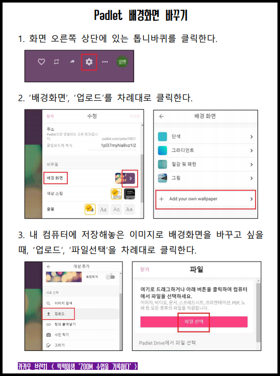 패들렛 자체에 감성적이고 예쁜 배경화면들이 많아 '선택'해 바꾸면 된다. 나는 수업에 맞는 이미지를 찾아 바탕화면에 저장했다가 배경화면을 즐겨 바꾼다. 배경화면을 수업 주제에 맞게 바꾸는 것은 우리가 수업을 하고 있다는 사실을 아이들에게 환기시키며 좀더 수업에 집중시키게 하기 위함이다.