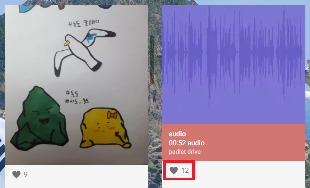작업 시간이 모두 끝난 후, 친구들이 올린 게시물을 하나하나 자세히 살펴 보고 잘했다고 생각하는 게시물에 '좋아요-하트'를 누르게 했다. 상호 평가 시간. 각 모둠의 게시물 하트 합계로 평가를 하고 보상을 했다.