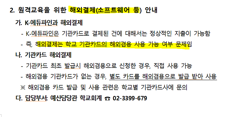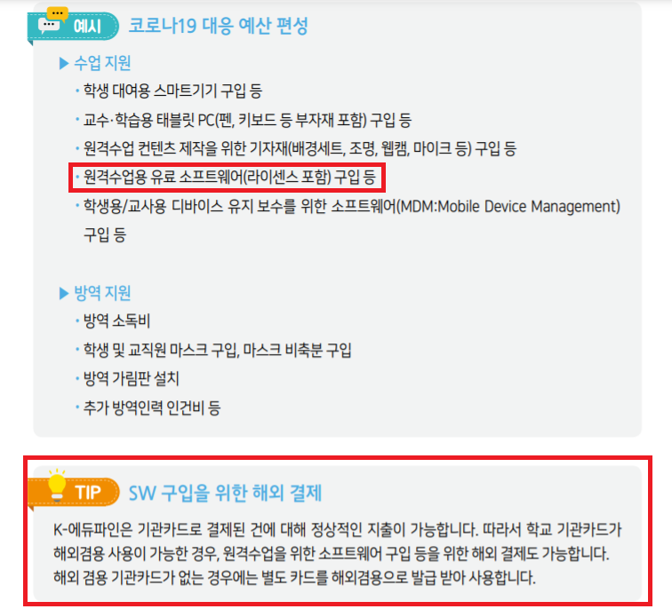 우리 학교 교장, 교감선생님은 선생님들이 필요로 하는 원격교육 기자재 및 에듀테크 프로그램 구입에 적극적으로 도와주신다. 그러나 그렇지 않은 학교 관리자분들과 행정실 직원들이 아직도 많다. 만일 그런 경우라면 그분들께 우선 공문을 보여드리길 권유한다. 필요한 분이 계실 것 같아 아래에 관련 자료를 첨부한다.