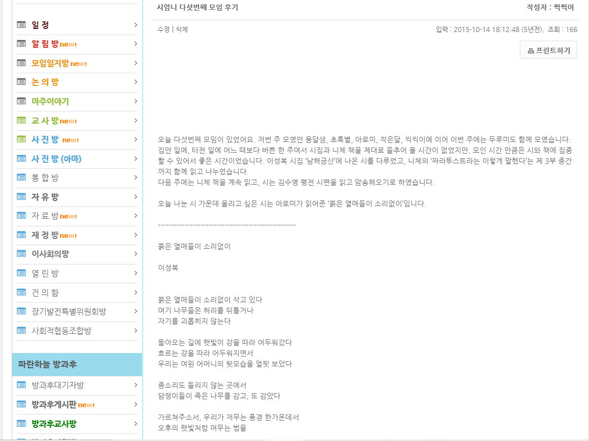 그해 가을, 겨울... 해가 바뀌어 복직하기 전 2월까지 약 5개월 동안 1주일에 한 번씩 우리 집에서 시엄니 모임을 했다. 이성복, 윤동주, 김수영, 백석 시를 만났다. 매주 시 한 편을 외워오고 모두 보는 앞에서 시를 암송했으며, 시와 우리의 삶을 나누었다. 가끔 원고지에 필사도 했다. 시를 외워오지 못해도 벌칙 같은 것은 없었는데, 시를 완전하게 외우려고 참 무던히도 노력했다. 시 적은 종이를 싱크대에 붙여놓고 설거지를 하는 중에 보며 외우기도 하고, 동네를 걷다가 보며 외우곤 했다. 김수영 전집 한 권을 다 공부하고 나서는 김수영 문학관도 함께 갔었다. 우리가 함께 시와 삶을 나눌 때, 나는 열심히 노트북으로 그 이야기들을 기록했고, 사진을 찍었고, 그 실시간 후기를 파란하늘 공동육아 홈페이지에 매주 올렸다. 우리 후기 게시글에 특히 아빠들이 응원을 많이 해주었다.