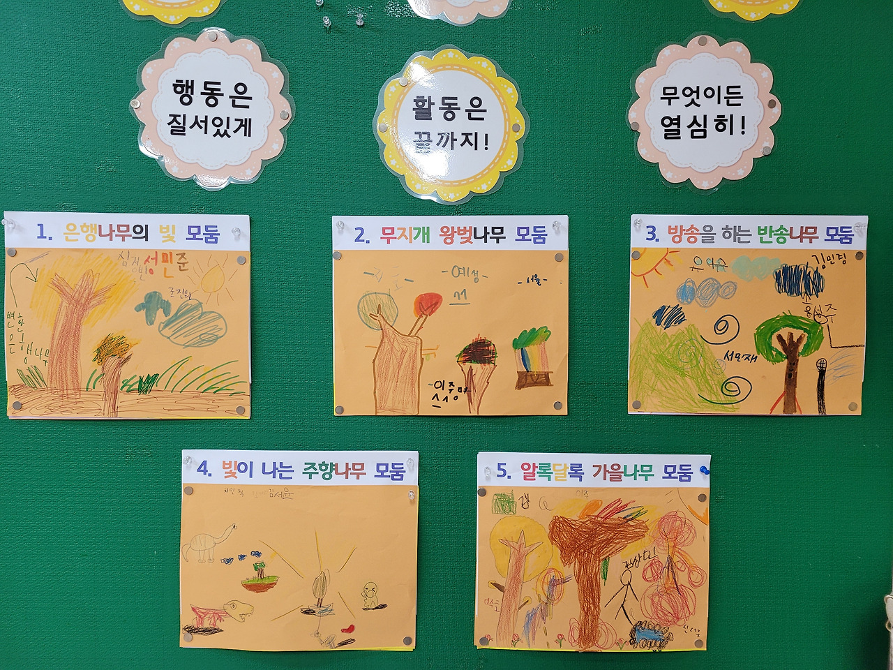 남학생 셋이서 알콩달콩 기싸움하며, 하나가 되다, 셋이 되다를 반복하고 있는 '은행나무의 빛' 모둠. '알록달록 왕벚나무'였지만. 5모둠에게 '알록달록'을 양보해 준 '무지개 왕벚나무' 모둠. 나무 기둥을 무지개로 그렸다. 방송 마이크를 나무 옆에 그린 '방송하는 반송나무' 모둠. 이젠 언어유희까지. 학교 텃밭 옆에서 이름 모를 나무를 발견하고 주목과 향나무를 닮았다고 주향 나무라 이름 붙인 '빛이 나는 주향 나무' 모둠. 아이들은 왜 이리 '빛'이라는 낱말을 좋아할까? 급하게 종이를 넘겨받다, 나무를 거꾸로 그렸지만, 나무는 물이 꼭 필요해서 연못을 그려 넣었다는 '알록달록 가을나무' 모둠.