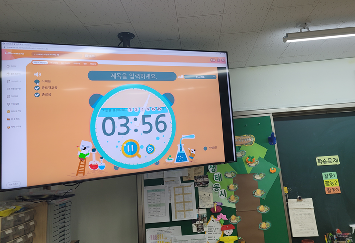 '내 안에 나무' 그림책으로 한글이랑 소풍 가기 수업을 하고 모둠 나무와 모둠 이름이 정해진 다음 날, 첫 줄에 앉은 모둠 1번에게 A4 종이 한 장을 주었다. 모둠 이름 주제에 맞게 자기가 그리고 싶은 것을 그리게 하고 시간이 되면, 뒷 줄에 앉은 모둠 2번에게 종이를 넘기게 했다. 생동감을 주기 위해, 9분으로 맞춘 타이머를 TV로 보여주었다. 한 사람당 1분 정도 시간을 주니, 두 턴 정도 돌 것 같았다.
