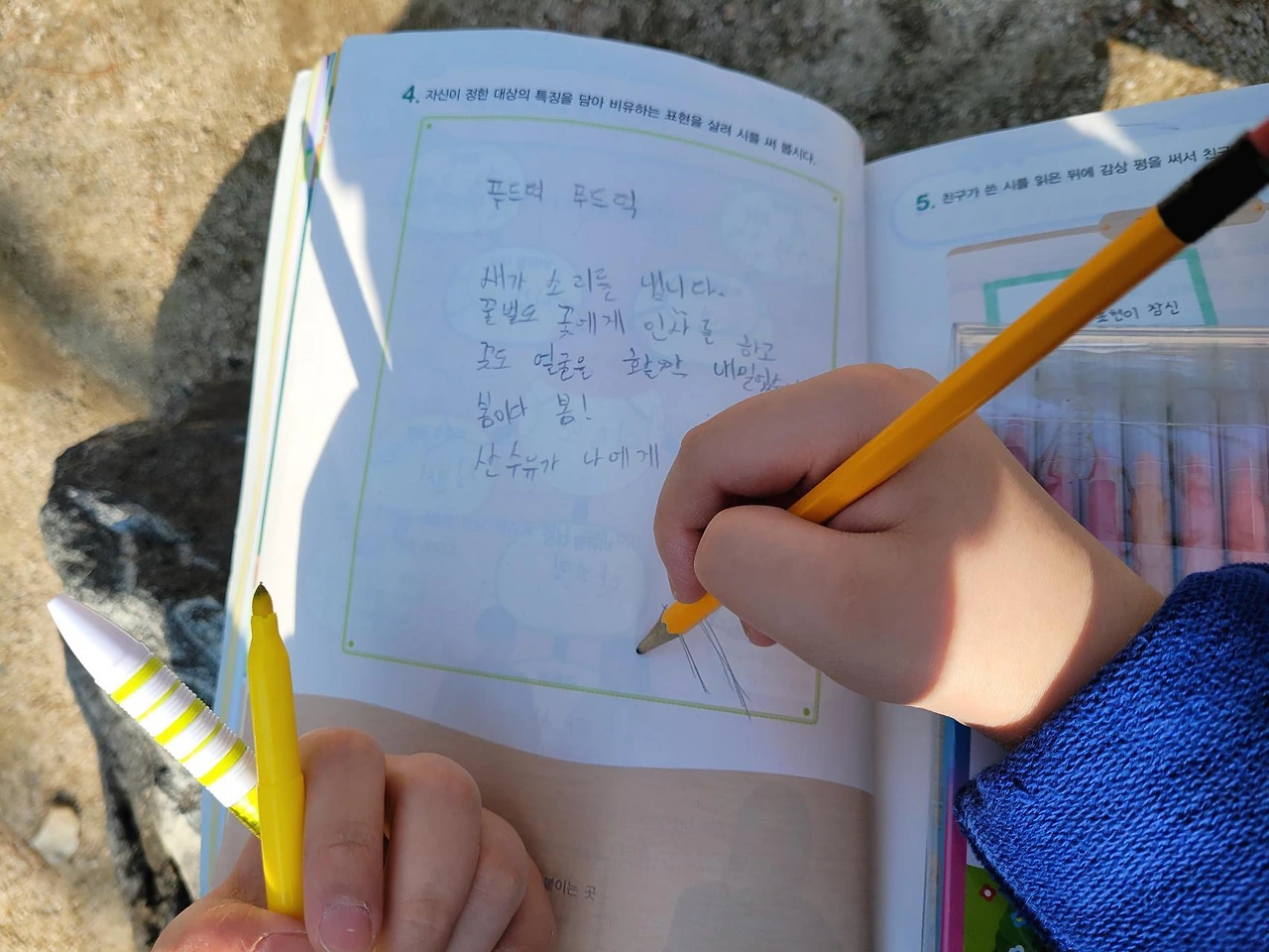 결국 모든 아이들이 시를 써냈다. 그림까지 다 그렸다. 국어 교과서가 온통 노랗다.