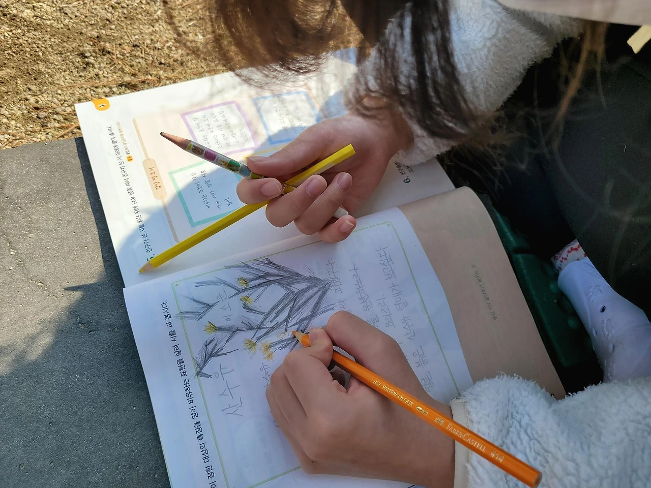 걱정하는 사이, 다른 곳을 바라보니, 제법 이 수업에 진지한 아이들이 눈에 보인다. 봄이는 어느새 시를 다 쓰고 산수유나무에 바짝 가까이 다가가 관찰하기에 빠져있다. 우리 반 화가 소연이도 시를 다 쓰고 그리기에 몰두해있다.