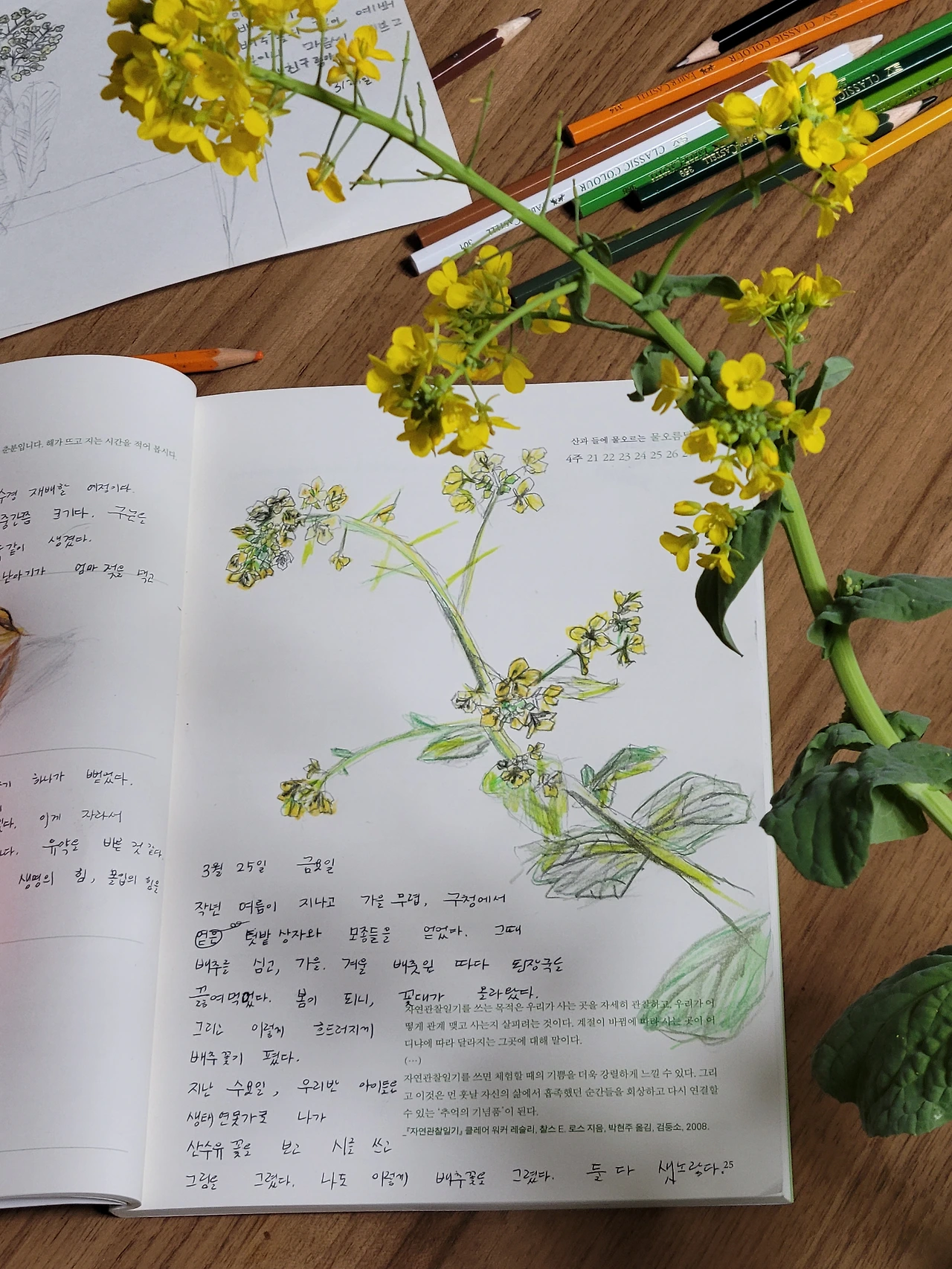며칠 후, 아이들이 노란 산수유를 그렸듯이, 나도 노란 배추꽃을 그려봤다. 자세히 살펴보니, 꽃피는 것에 규칙이 있었다. 끝에 달린 꽃봉오리부터 펴고, 점점 안쪽 꽃봉오리 순서로 피어났다. 배추꽃들이 따라 펴나보다.