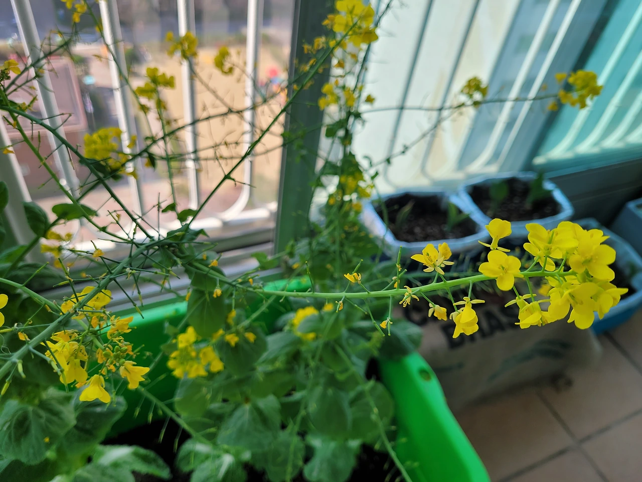 퇴근하고 돌아오니, 이번엔 우리집 베란다 노란 배추꽃이 자꾸 눈에 밟혔다. 작년 **구청에서 텃밭상자와 함께 배추 모종을 배부받았다. 부지런히 자라는 배춧잎 따다 작년 가을, 겨울 내내 된장국을 끓여 먹었다. 봄이 되어, 텃밭 상자를 정리할 겸, 배추를 다 뽑아버릴까 싶었지만 3월 한 달 내내 바빠 그냥 내버려 뒀다. 그러던 배추가 3월 말 꽃대가 쑥쑥 올라오더니, 하나 둘 노랗게 노랗게 꽃이 폈다. 배추꽃이 이렇게 예쁠 줄이야. 멀리서 보면, 마치 유채꽃 같다.