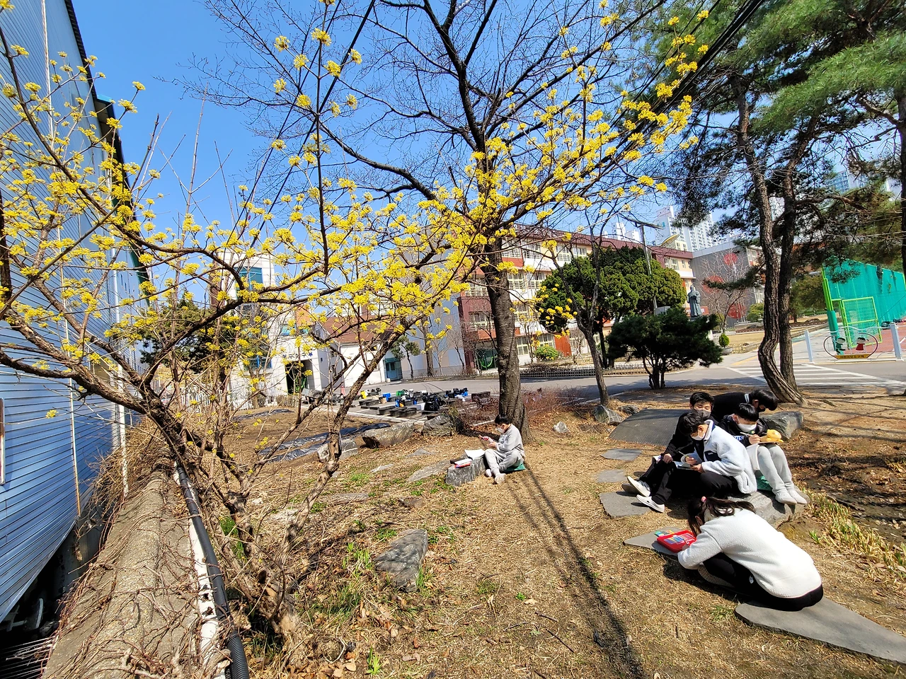 담임 선생님이 산수유나무는 무조건 그리라고 했으니, 아이들은 우선 산수유나무 근처에 모여 앉는다. 그런데 재잘재잘 떠드느라 정신이 없다.