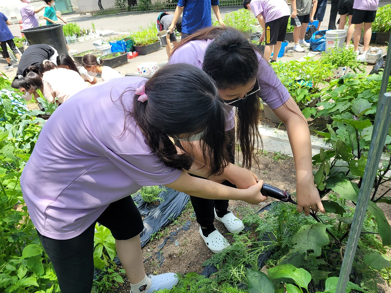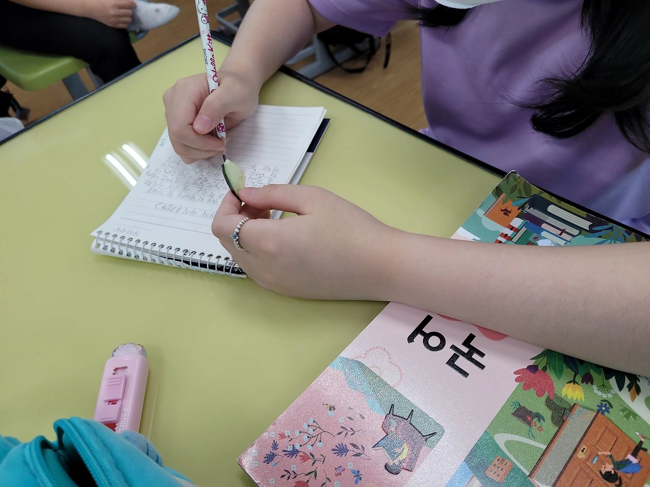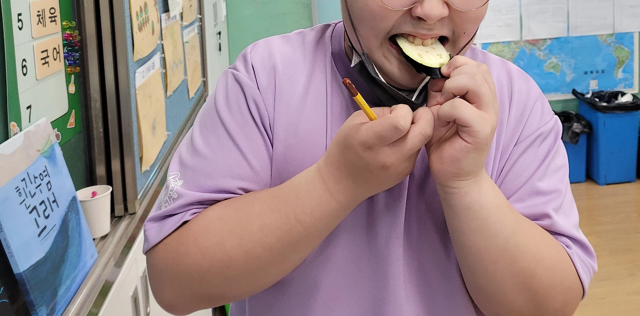 오늘 텃밭에서 아주 통통하고 튼실한 가지가 열려 있었다. 선생님께서 오늘은 가지를 먹어보겠다고 하시며 연주와 가지를 땄다. 그리고 교실에 와서 가지를 먹었다. 가지를 안 좋아하기도 하고 무침으로만 먹어보아서 생가지는 안 먹었는데 생으로 먹다니. 처음엔 우걱우걱 먹어서 맛이 묘하면서도 오묘했다. 그런데 먹을 만했다. 입에서 물컹한 것이 느껴졌다. 한 입 물었더니 푹신하면서 시원한 물이 터졌다. 먹을 만했다.