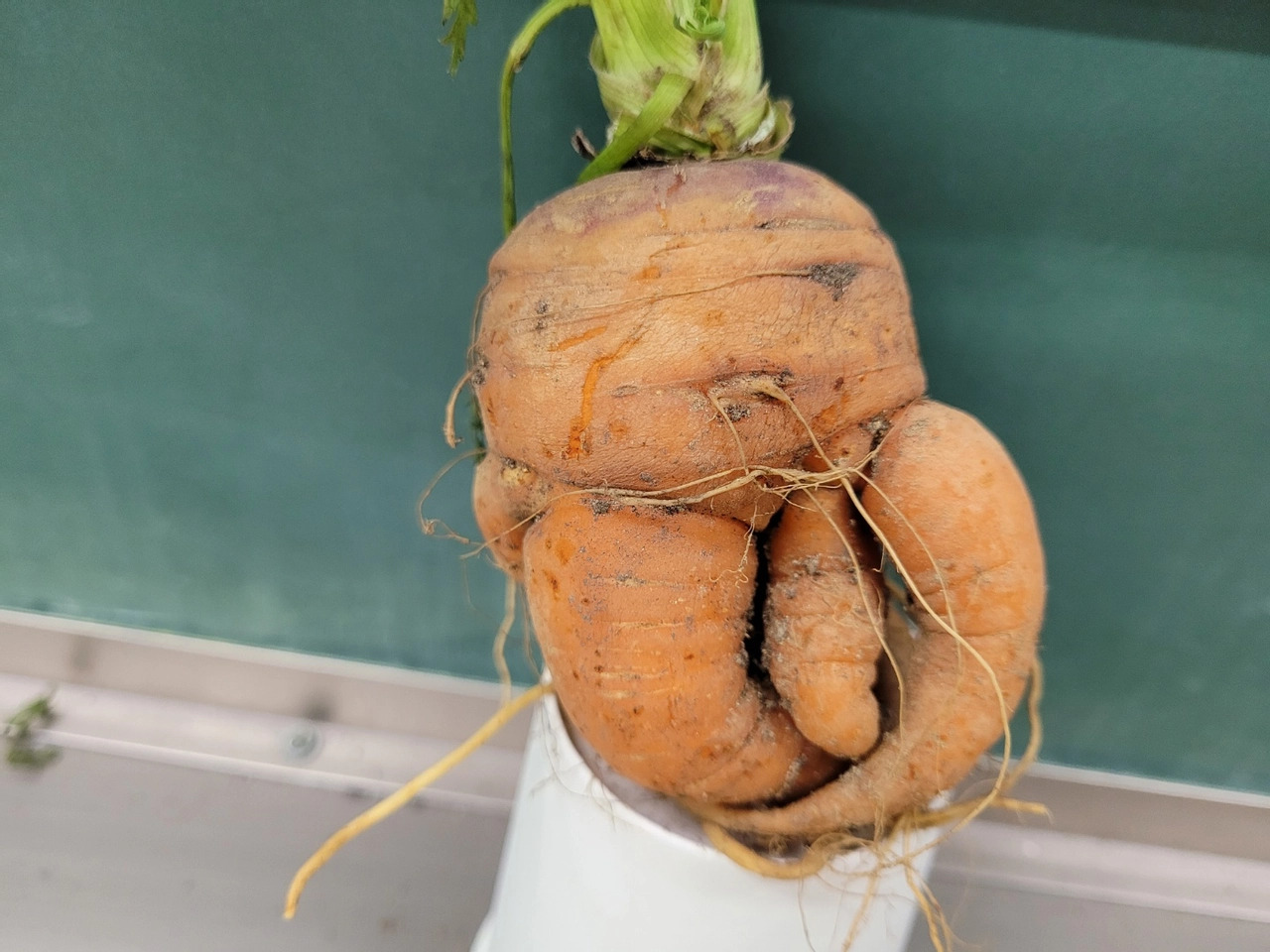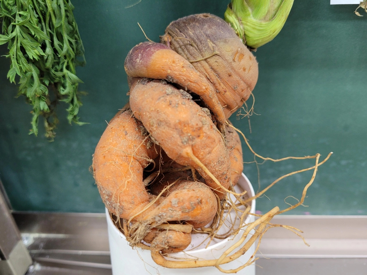 우리 텃밭의 당근들은 신기한 모양을 가지고 있다. 보통 파는 당근들은 길쭉하고 뾰족한 모양인데 우리 반 당근들은 신기하게 생겼다. 내가 이름을 지어줬는데 당근 게장이다. 게처럼 생겨서이다. 살짝 오돌토돌하고 냄새는 조금 달달한 냄새가 난다. (이경*)