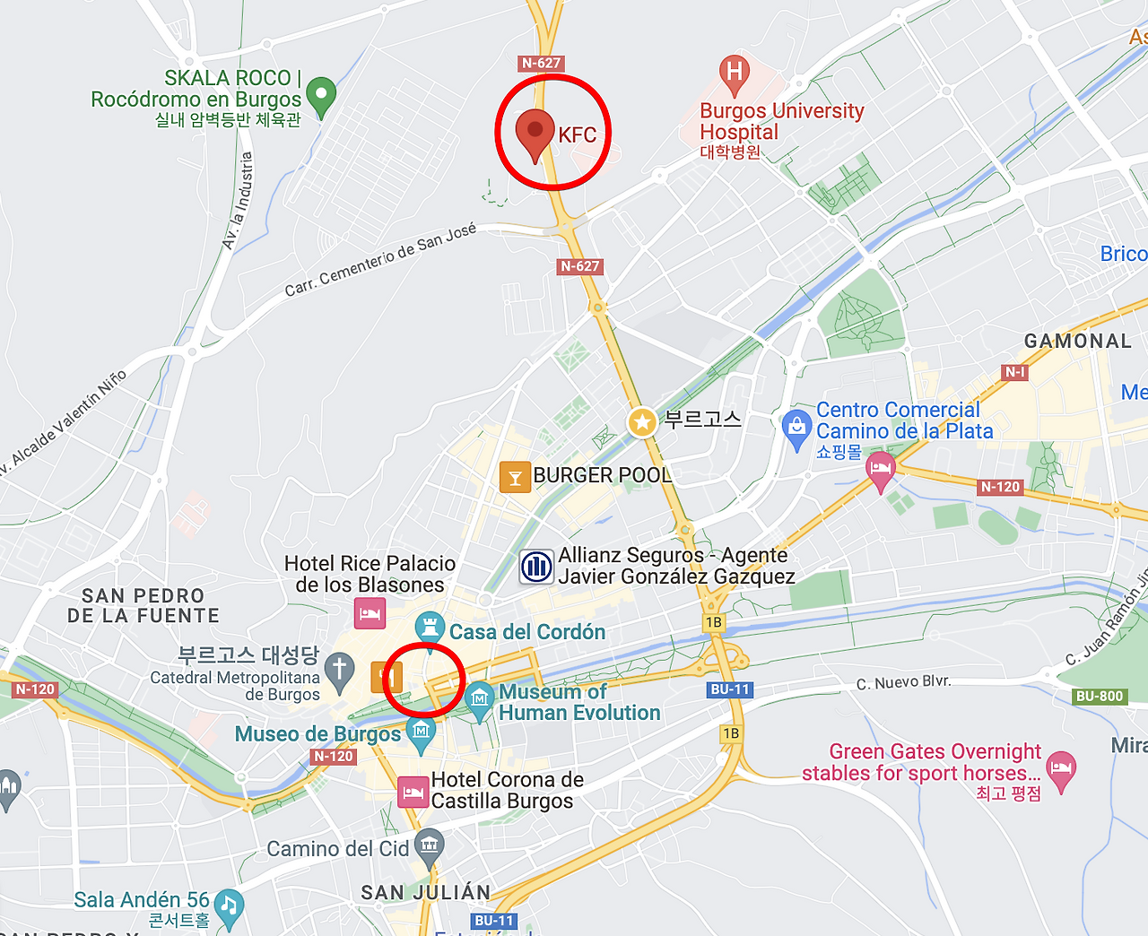 위의 두 집을 돌고, 마지막으로 가기로 한 곳이 KFC였는데, 이런.. KFC가 생각보다 멀었다. 부르고스 도심에서 차를 타고 외곽으로 조금 빠져나가야지만 갈 수 있는 아웃렛 안에 있었다. 거기까지 걸어가기엔 좀 멀고(산티아고 길을 걷는 동안에는 밥을 먹기 위해 걷는 것에 조금 인색해지는 경향이 있다.) 택시를 타자니 왠지 모르게 마음에 걸렸다. 그… 뭐랄까, 순례자라는 이름을 달고 밥 먹자고 택시를 타고 간다는 게.