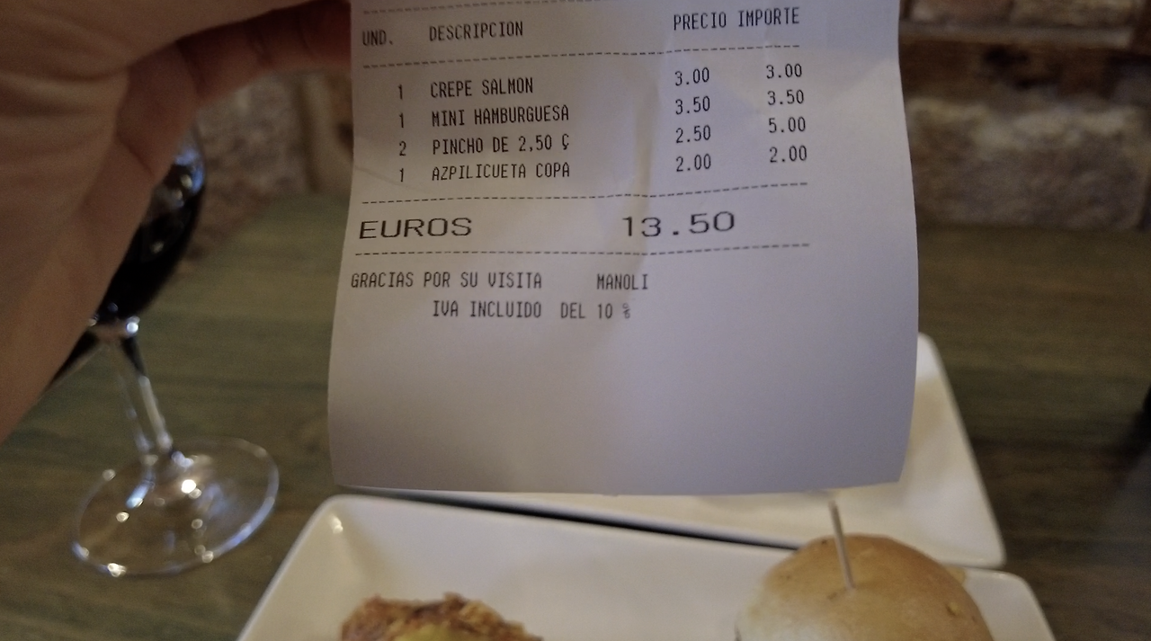 타파스 네 개와 와인 한 잔 13.5유로(약 1.8만 원)