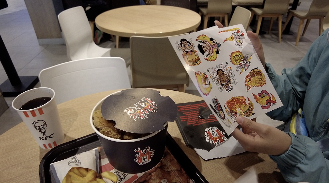 이곳 KFC는 특이하게 닭 봉과 윙으로만 구성된 메뉴가 있었다. 버킷 한가득 고소한 튀김향을 내는 후라이드 치킨이 담겨왔다. 그리고 드디어 그중 한 조각을 입에 갖다 대었다.