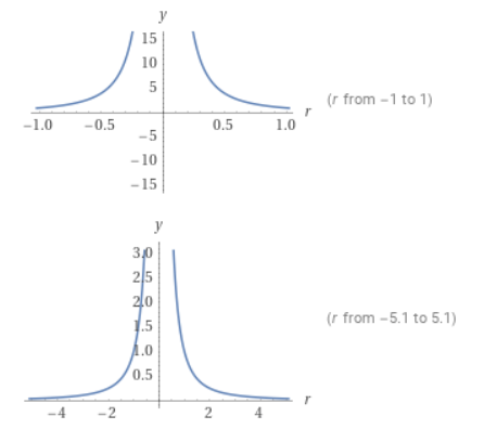 로 주어지는데, (Q는 원천전하의 전하량, q는 시험전하의 전하량, r은 거리) 거리에 따른 힘을 그래프로 표현하면 아래와 같다. 두 그래프는 같은 그래프이며 x, y축의 스케일을 달리 한 것이다. x축이 전하의 중심으로부터 거리, y축이 척력이다.