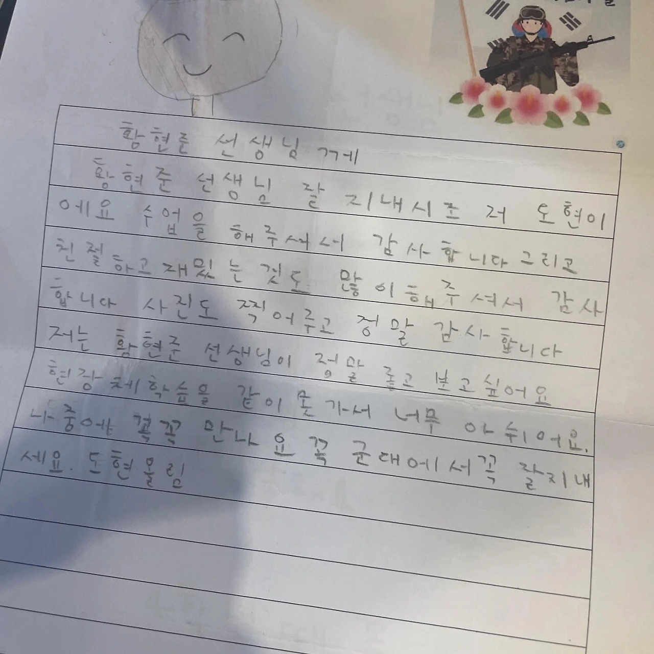 스승의 날이나 평소에 편지를 받는 날은 많았으나 군대 안에서 국군의 날에 보고 싶은 아이들의 편지를 받으니 감회가 정말 새로웠다.