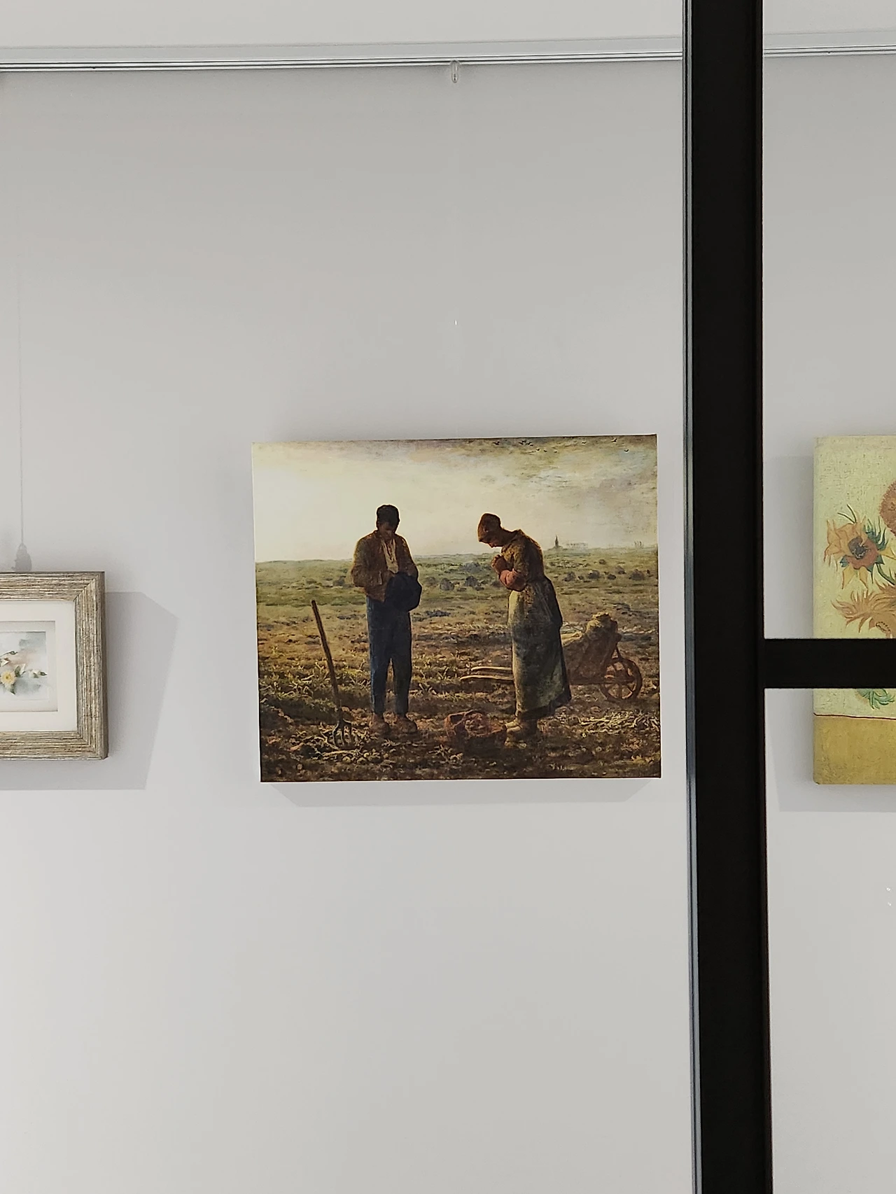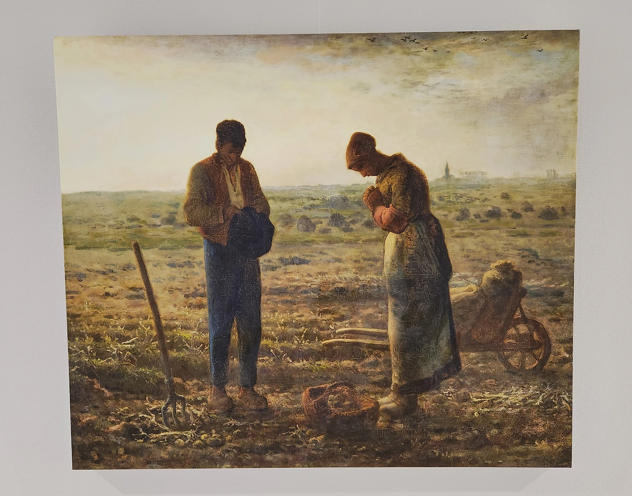 저녁노을이 지는 일터에서 만종소리에 맞춰 일손을 멈추고 기도하는 부부의 모습은 한없이 경건하고 감동스럽다. 경건하게 머리 숙인 부부의 주변의 풍경들이 하나씩 선명하게 시야에 들어왔다. 황량하고 거친 경작지, 부부 곁에 놓인 쇠스랑과 한가득 짐이 실린 채 뉘어 있는 나무수레, 그리고 발아래 놓인 투박한 감자 바구니를 보면서 힘겨운 노동의 일상이 고스란히 느껴졌다.