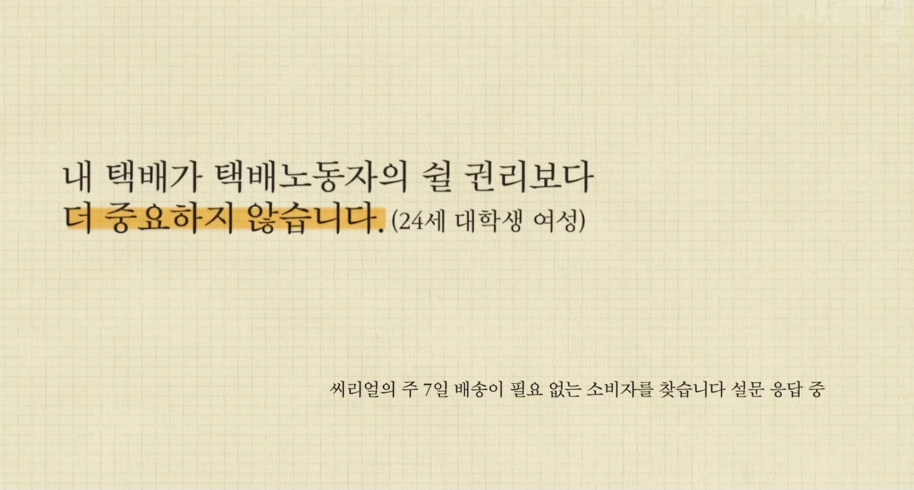 "택배 이 이렇게 빨리 받아야 하는 이유가 있는 걸까요? 이게 옳은 걸까요?"