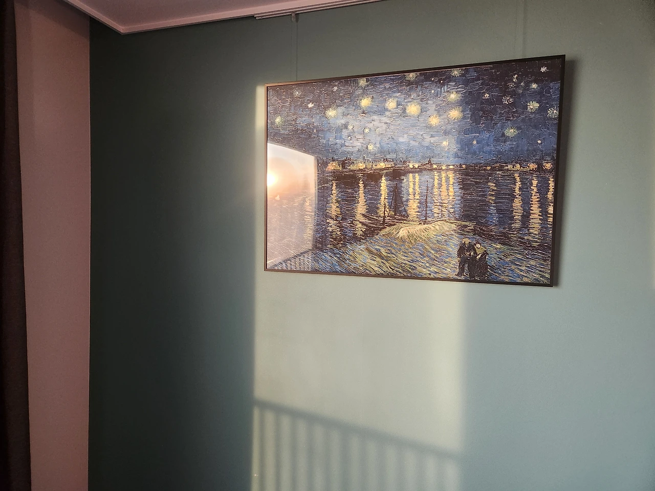 그래서일까. 그냥 조용히 새해를 맞이 하고 싶었다. 창밖으로 붉은 해가 떠올랐다며 사진을 찍는 아내를 슬며시 외면했다. 그런데 내 눈길이 벽에 걸린 액자 <론강의 별이 빛나는 밤>에, 정확히 말해서 액자 위에 비친 첫해를 바라보고 있었다.