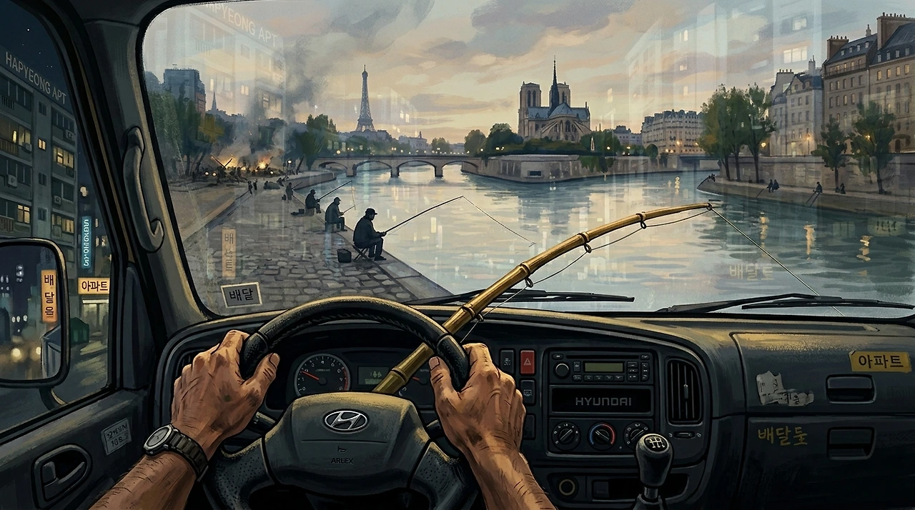 순간, 나의 탑차 운전대는 요동치는 세상 한가운데서 내가 쥘 수 있는 작은 낚싯대가 되었다. 오늘 나는, 센강 대신 익숙한 아파트 단지들과 골목사이로 택배차를 몰며 평범한 일상을 낚기 위한 희망의 끈을 조용히 드리우고 있었다.