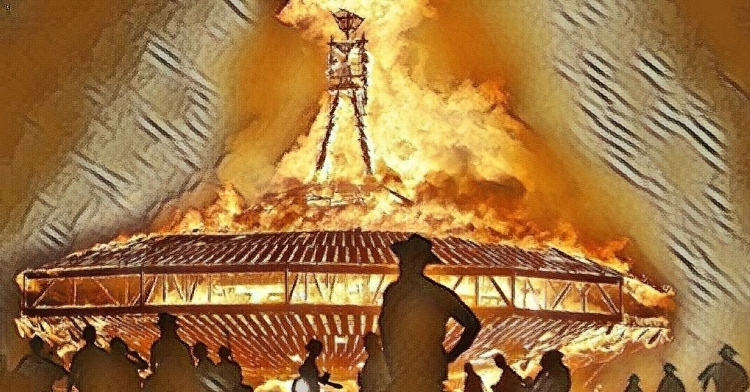 사막의 짙은 어둠 속에서 거대한 조형물이 강렬한 붉은 불길에 휩싸이고 사람들의 환호성이 터져 나온다. 곧이어 음악과 춤으로 모든 사람이 하나로 어우러진다.