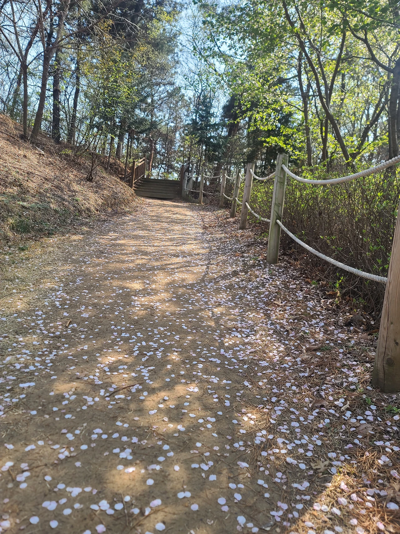 사람들과 떨어져 살았지만 소로우는 사람과의 교제를 즐기고 열정적으로 만났다. 관계에 시들해지면 숲 속의 푸른 나무들과 산새들을 통해 삶의 활력을 재충전받았다. 금방이라도 방아쇠를 당길 것같이 팽팽해진 마음의 긴장과 적대감을 이완시키고 누그러뜨리기에는 <푸른 숲>만큼 좋은 처방제는 없으리라. 월든호수에게서 감미롭고 자애로운 우정을 그가 느낀 것처럼 곧 떨어져 버릴 것 같은 벚꽃들을 아쉬워 하며 뒷동산 숲길을 향했다. 벌써 벚꽃잎들이 양탄자를 깔고 반겨주듯 바닥에 흩날리고 있다.