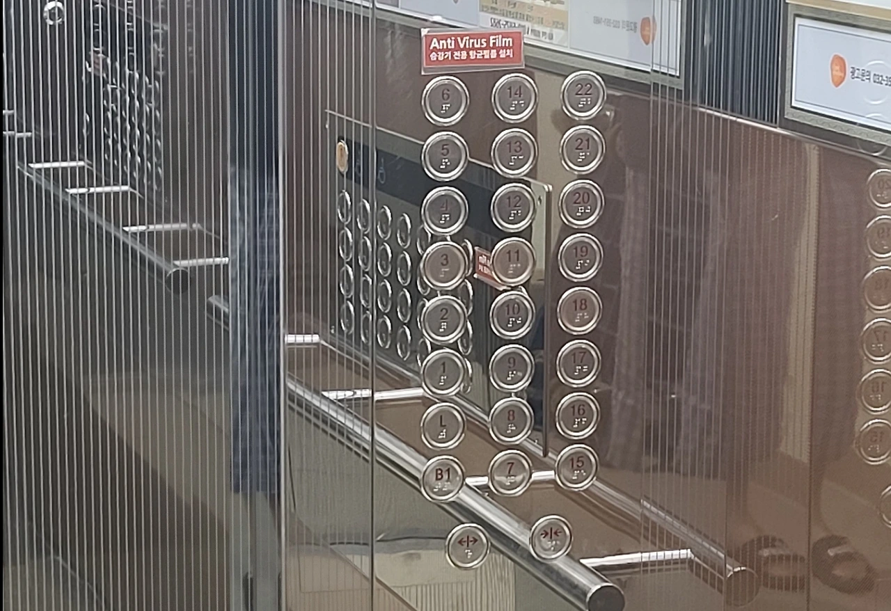 엘리베이터 안에서 약 20초간 형성되는 폐쇄된 공간은 영화나 드라마에서 종종 호러, 공포, 은밀한 색다른 소재로 활용되기도 하지만 실상은 알지 못하는 타인들이 서로 다른 목적으로 잠시 동행하면서 어색하고 불편한 긴장감을 불러오는 묘한 곳이기도 하다. 유난히 커버가 닳은 닫힘 버튼의 상태는 무수히 많은 조바심의 손길들이 난타했음을 짐작하게 한다.