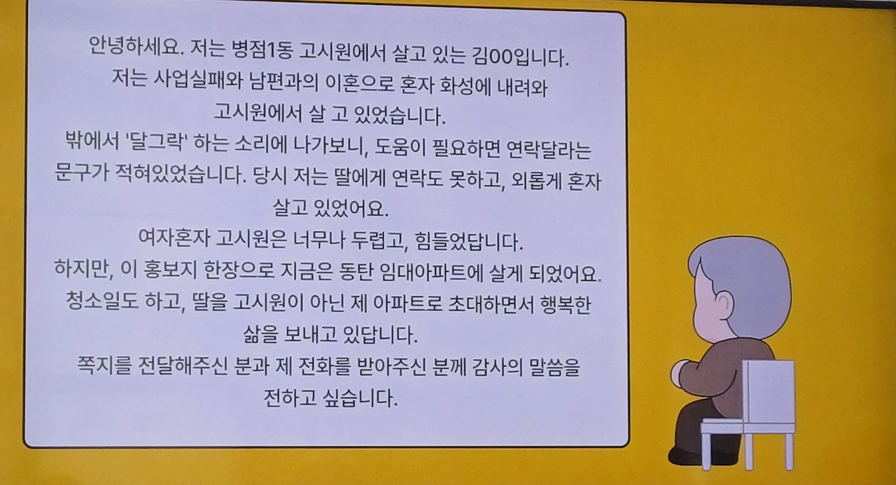 전단지와 밀키트를 들며 가가호호 방문하며 문고리 작업했던 뜨거운 여름도 있었다. 손 편지를 써서 누룽지와 안 내지를 봉투에 넣는 작업들... 작은 일들이지만 누군가에게는 큰 의미가 되리라 믿었다.
