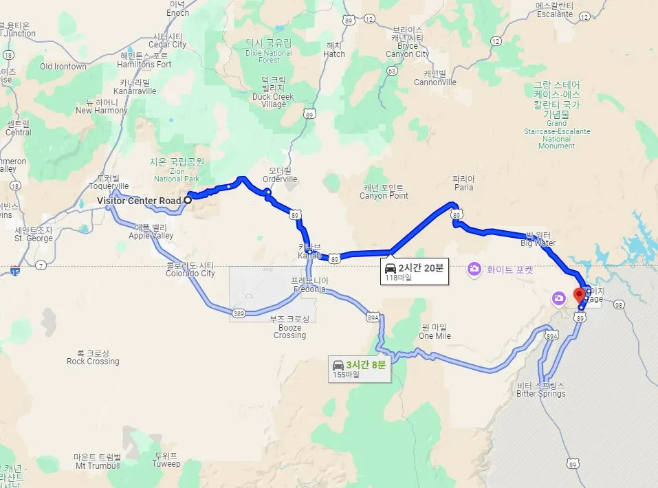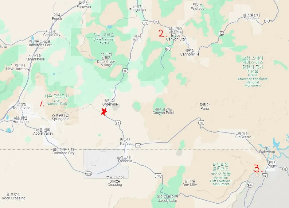 이곳에서 89번 도로를 따라 북쪽으로 약 60마일(97km)을 올라가면, 브라이스 캐년(Bryce Canyon)을 만날 수 있다. 캠핑카 기준으로 도로를 달리면 약 1시간반 정도 거리다.
