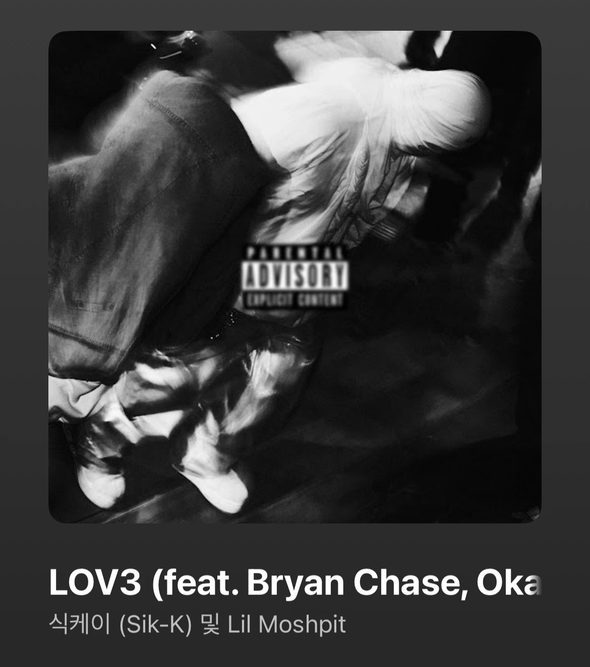 저 제목은 LOV3라는 노래 가사다. 릴모쉬핏(이휘민, 그루비룸), 식케이 등이 참여한 K-FLIP이라는 앨범 수록곡이다. 에픽하이의 Love Love Love를 샘플링한 리메이크곡이기도 하다.