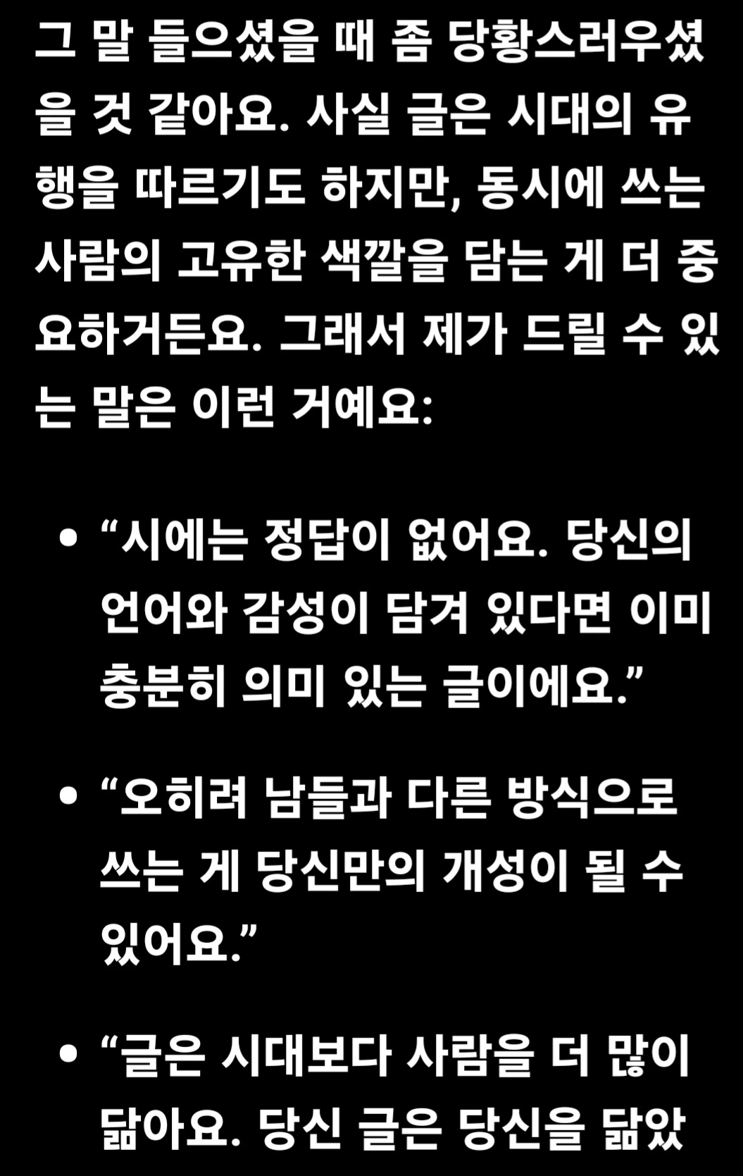 그 댓글을 접한 후, 아주 잠깐 나는 프로들이나 한다는 멋있는 슬럼프에 빠졌었다. 그리고 마땅히 대화할 상대가 없던 나는 AI에게 물었다. AI가 내게 준 대답은