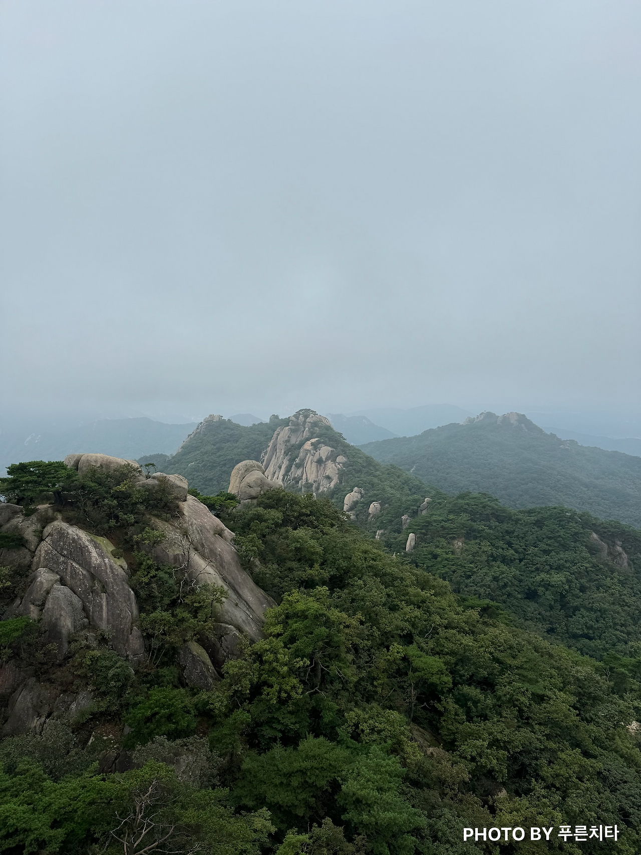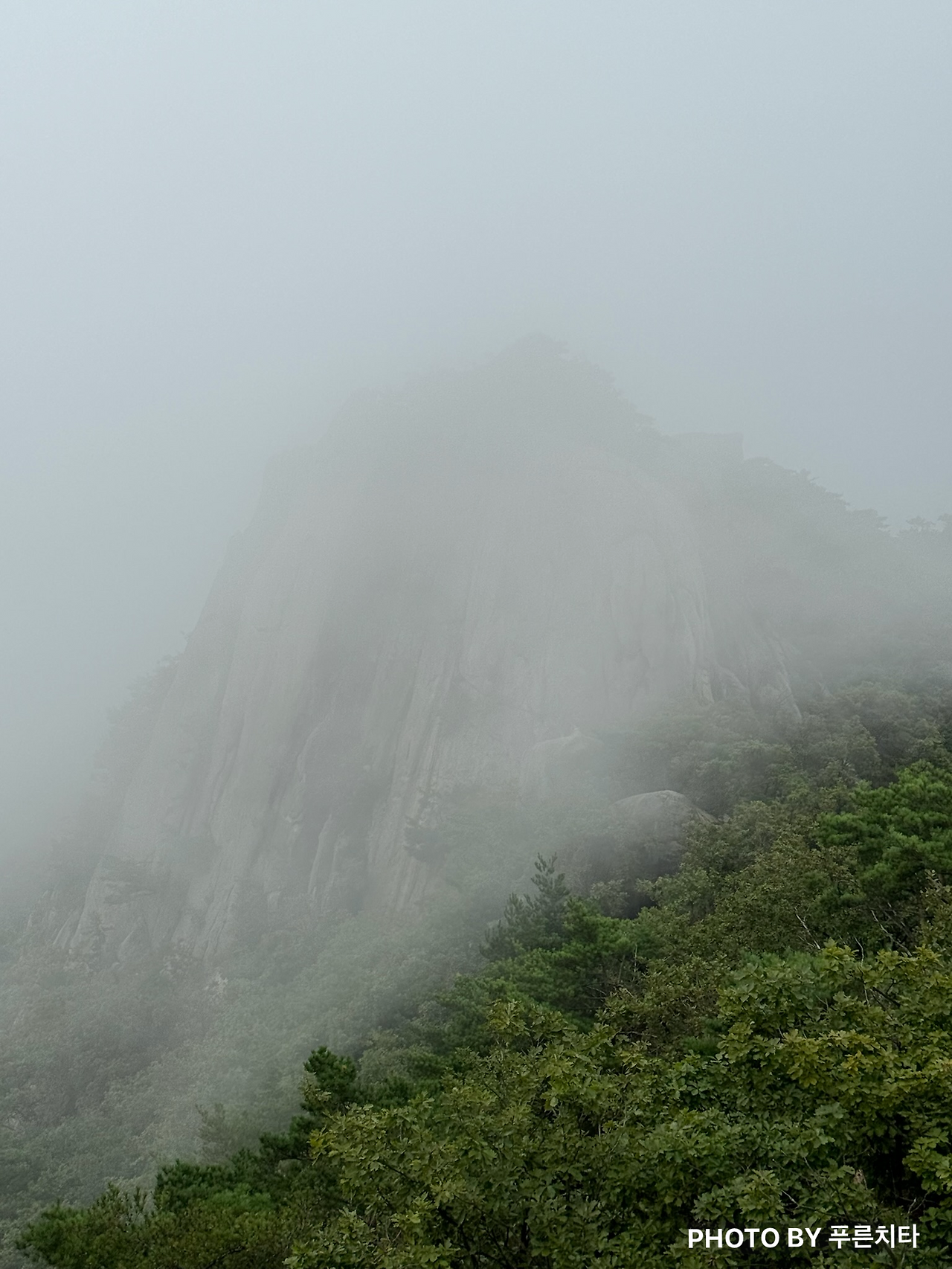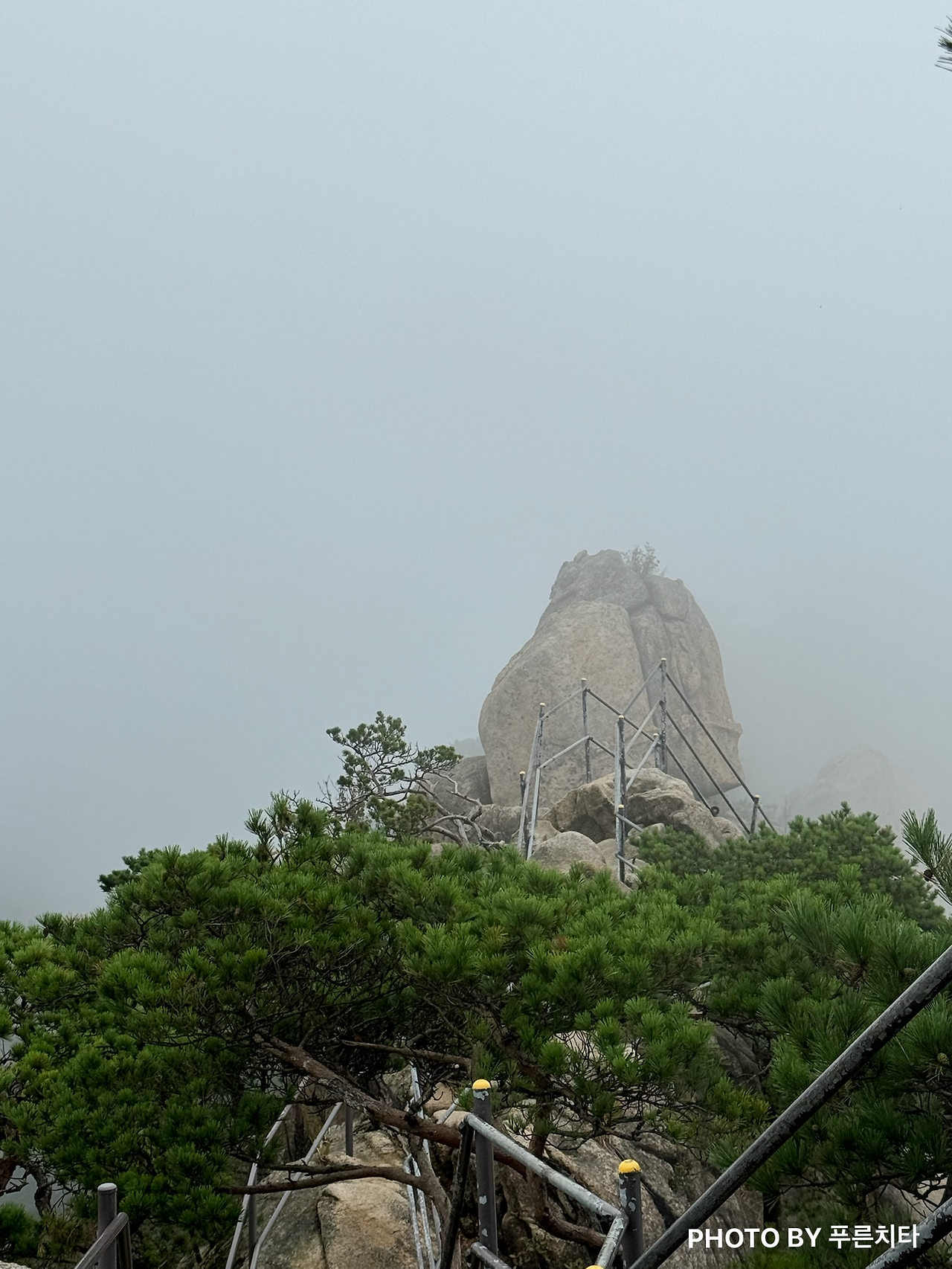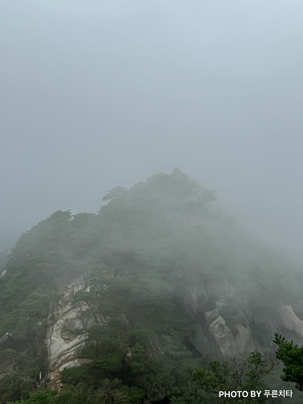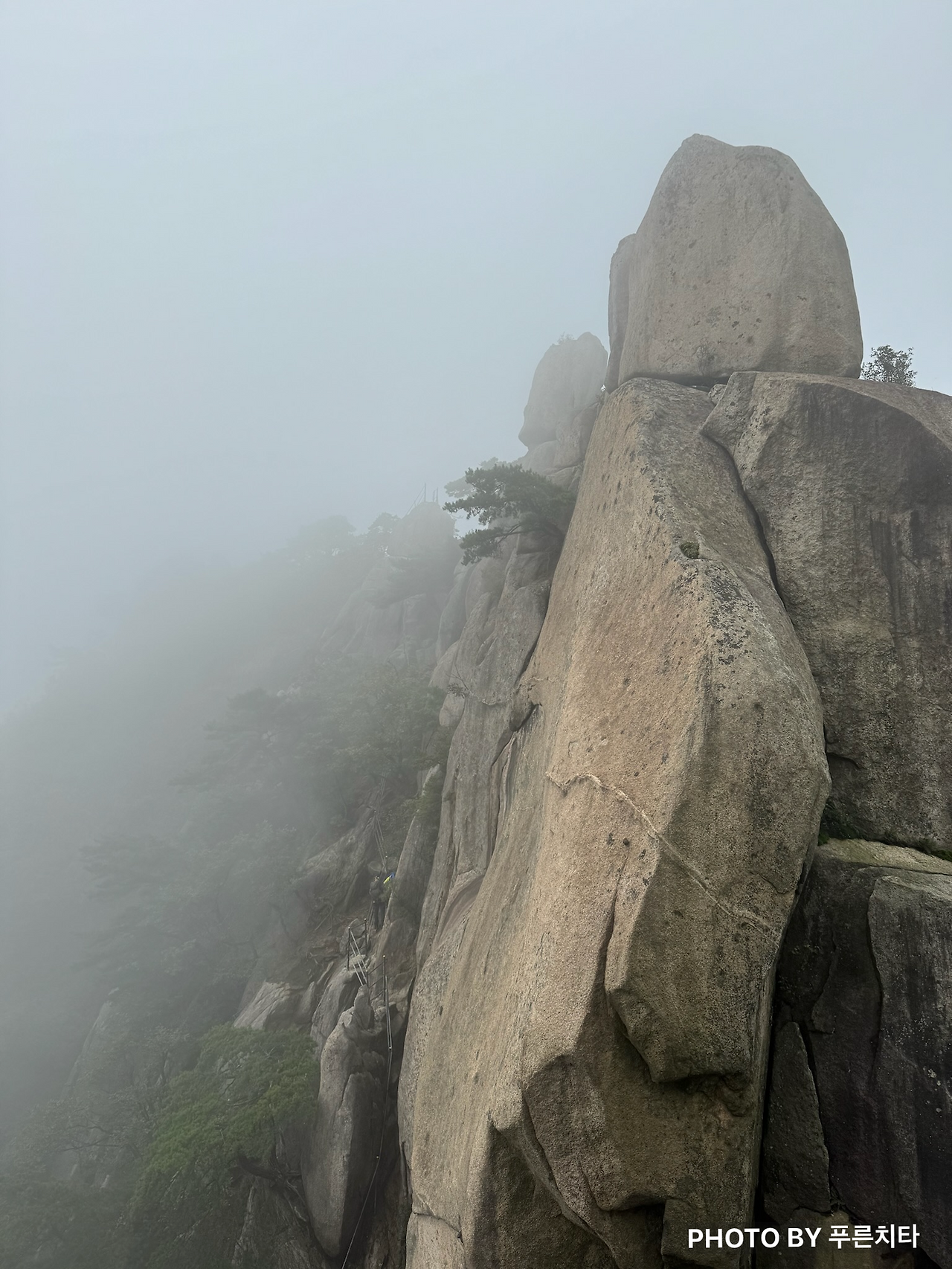 이번에도 도봉산의 대표 코스인 와이계곡을 거쳐서 갔다. 2번째라서 그런지 처음보단 수월하게 갈 수 있었다. 와이계곡을 지나 조금 더 오르면 정상 ’신선대‘에 도착한다. 비는 그쳤어도 운무가 있어서 딱히 뭐가 보이지 않았다. 이런 상태를 일명 ’곰탕‘이라고 한다는 건 나중에 알게 되었다. 아무튼 곰탕이어도 아쉽지는 않았다. 도봉산 정상은 ‘신선대’인데 안개 때문인지 신선이 풍류를 즐길 것 같은 분위기였다. 바위를 감싸고 있는 운무가 바람에 따라 움직이는 모습도 운치가 있어서 좋았다.